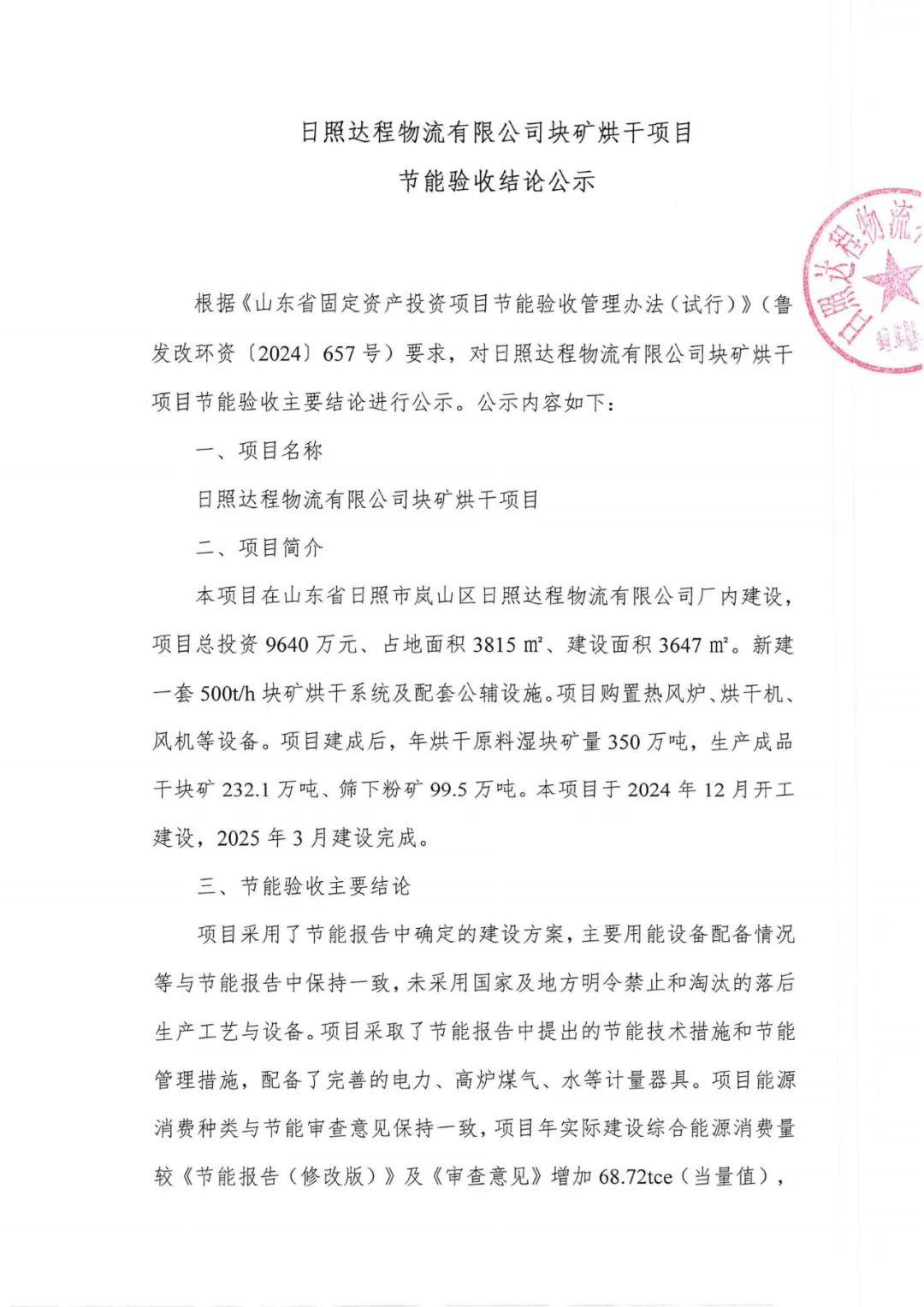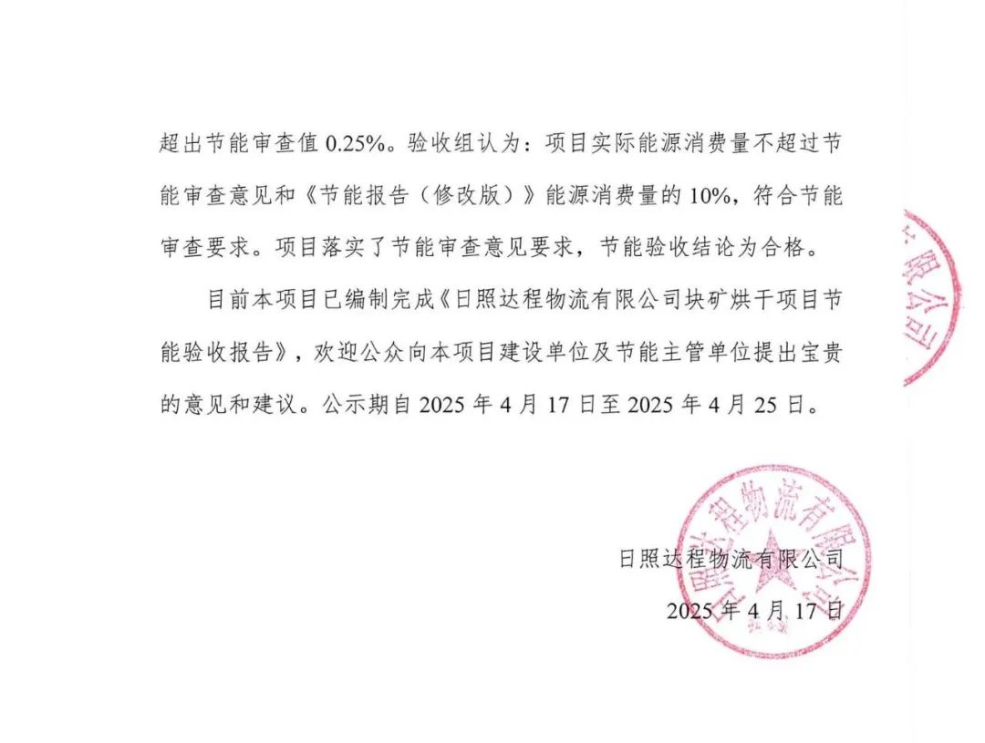 近日,日照鋼鐵控股集團有限公司官網發布《日照達程物流有限公司塊礦烘干項目節能驗收公示》——