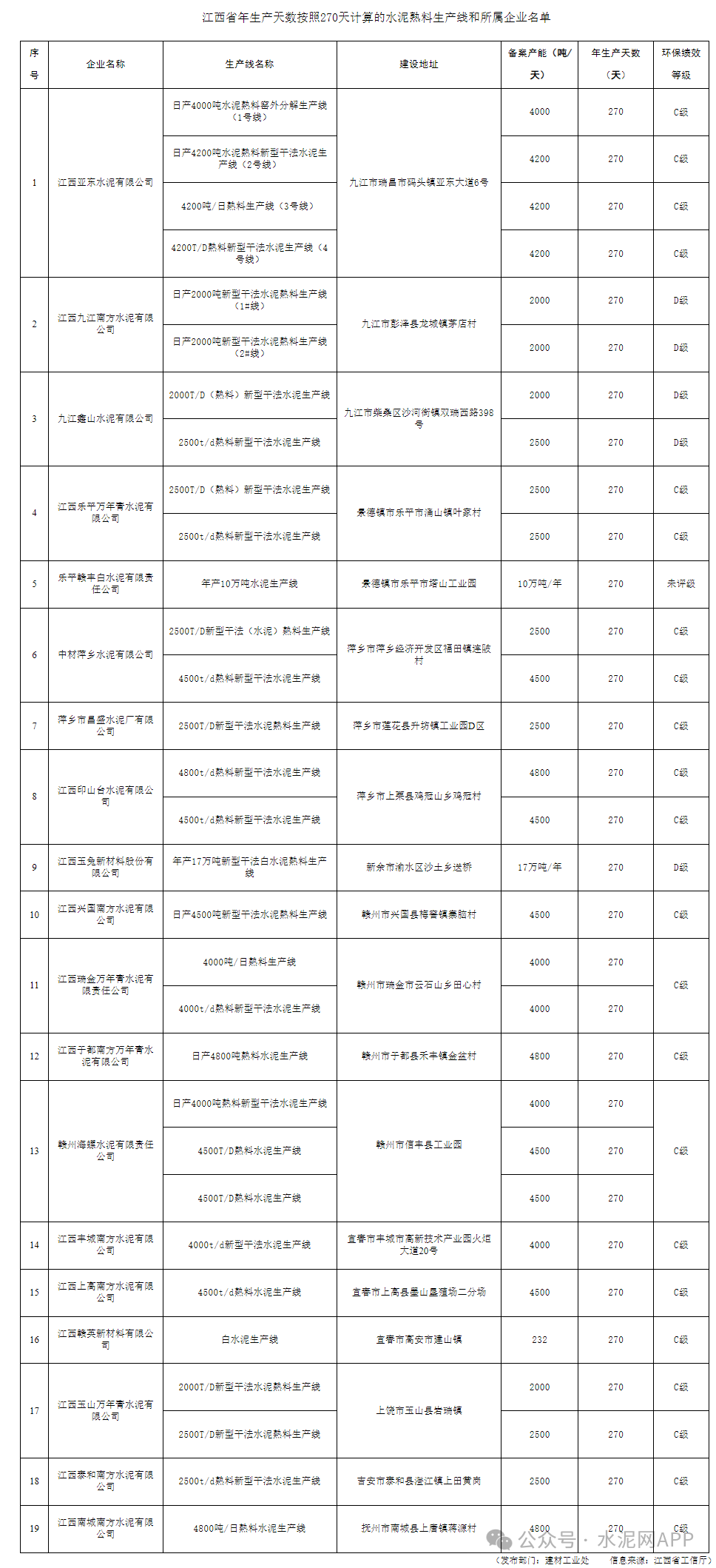 近日,江西工信廳發(fā)布“關(guān)于年生產(chǎn)時(shí)間按照270天計(jì)算的水泥熟料生產(chǎn)線(xiàn)和所屬企業(yè)名單的公示”。