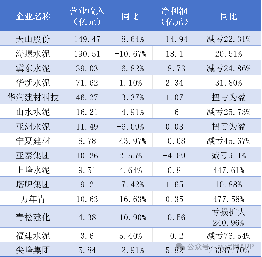 華潤建材科技:2025年一季度實現(xiàn)營業(yè)收入46.27億元,同比下降3.37%,歸屬母公司凈利潤1.07億元,同比扭虧為盈,去年同期虧損2887.40萬元。山水水泥:一季度公司經(jīng)營收入16.2億元人民幣,上年同期為17.05億元,同比下降4.91%,歸屬母公司凈虧損6億元,虧損同比減少25.73%。亞洲水泥(中國):一季度收益11.49億元,同比減少6.09%;擁有人應占未經(jīng)審核綜合溢利(歸母凈利潤)約為人民幣308.1萬元,同比扭虧為盈。寧夏建材:一季度營業(yè)收入為8.78億元,同比下降43.97%;歸母凈利潤自去年同期虧損1547萬元變?yōu)樘潛p841萬元,虧損額有所減少。亞泰集團:公司一季度營業(yè)收入為10.26億元,同比增長2.55%;歸母凈利潤為-4.69億元,去年同期凈虧損5.16億元,同比減虧。上峰水泥:第一季度實現(xiàn)營業(yè)收入9.51億元,同比增長4.64%;歸屬于上市公司股東的凈利潤為7993.43萬元,同比增長447.61%。塔牌集團:第一季度實現(xiàn)營業(yè)收入9.2億元,同比下降7.42%;實現(xiàn)歸屬于上市公司股東的凈利潤1.65億元,同比增長10.88%。萬年青:第一季度公司實現(xiàn)營業(yè)收入10.63億元,同比下降16.63%。歸屬于上市公司股東的凈利潤3534.52萬元,同比增長477.58%。青松建化:公司第一季度營業(yè)收入4.38億元,同比下降10.93%;歸屬于上市公司股東的凈虧損5553.10萬元,虧損擴大。