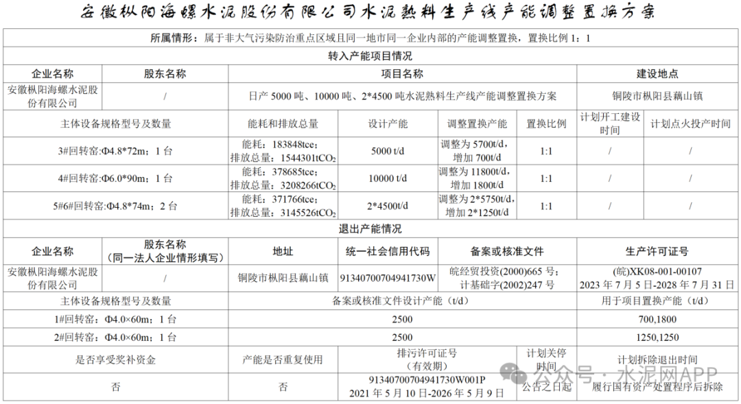 5月13日,安徽省工信廳發布“關于安徽樅陽海螺水泥股份有限公司水泥熟料生產線項目產能調整置換方案的公示”。