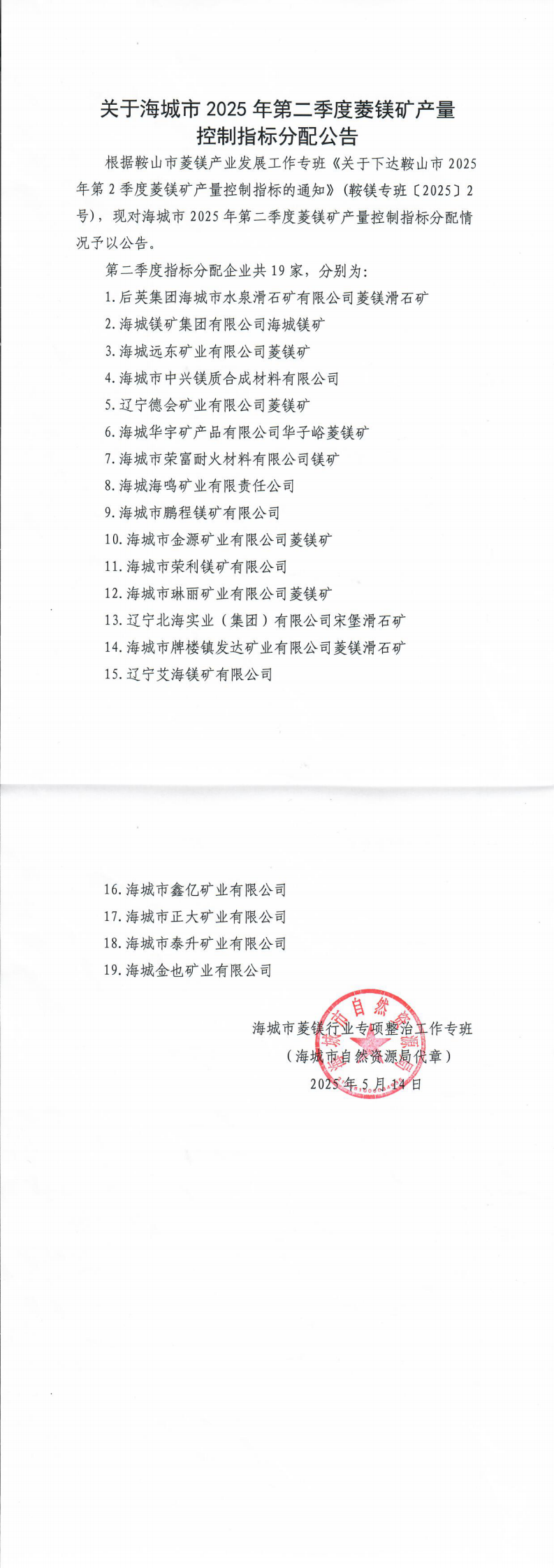 關于海城市2025年第二季度菱鎂礦產量控制指標分配公告