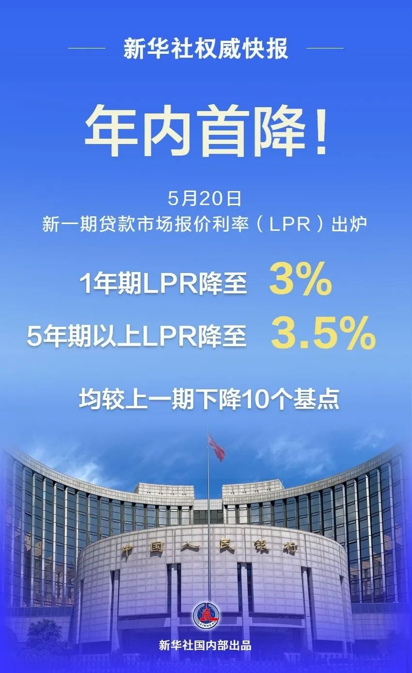 中國人民銀行授權全國銀行間同業拆借中心公布,2025年5月20日貸款市場報價利率(LPR)為:1年期LPR為3.0%,5年期以上LPR為3.5%。以上LPR在下一次發布LPR之前有效。