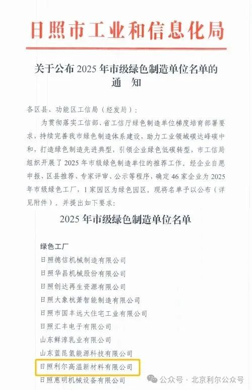 近日,日照市工業和信息化局公布了2025年市級綠色制造單位,日照利爾高溫新材料有限公司被評為綠色工廠。